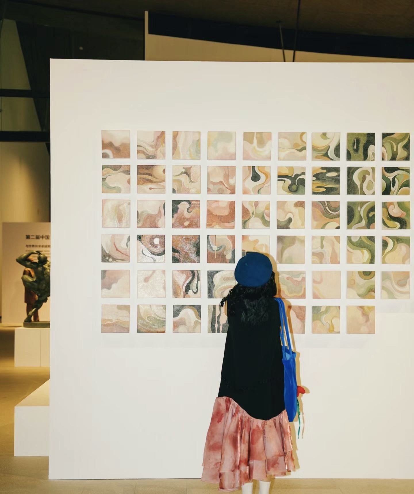 色彩系统直接对话敦煌色谱,作品以暖调的赭石、米白、浅褐,间杂灰绿、暗粉的低饱和色,如莫高窟的岩壁与岁月痕迹;